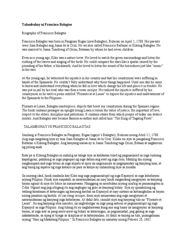 Noong 1849 inutos ni Gobernador-Heneral Narciso Claveria na ang bawat katutubong Pilipino ay magkaroon ng apelyidong Espanyol. Sevilla at Tolentino in the early 1920s. TALAMBUHAY NI FRANCISCO BALTAZAR BALAGTAS Hindi maaring sumulat ng ukol sa pnitikang Tagalog nang d.