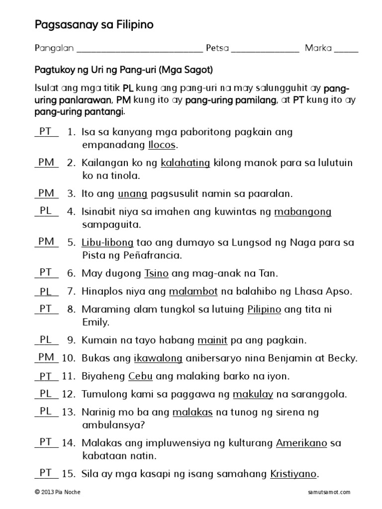 The student is asked to classify the adjective in bold in each sentence as panlarawan pantangi or pamilang. Found worksheet you are looking for. Some of the worksheets for this concept are Pang uri na panlarawan Pagsasanay sa filipino Pagsasanay sa filipino Panghalip na pananong set a.