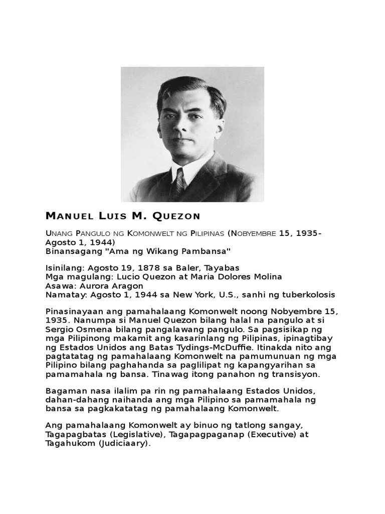 He was the first Filipino to head a government of the entire Philippines as opposed to the government of previous Philippine. QUEZON Sa talatang ito ating alamin at tukasin ang talambuhay ni Manuel L. Ika-28 ng Abril 2005 nang iniutos ni Pangulong Gloria Macapagal-Arroyo na ang mga labi ng dating Unang Ginang Aurora Aragon Quezon na tinambangan at pinatay sa daan patungong Bongabon sa Nueva Ecija noong ika-28 ng Abril 1949 ay hukayin sa dati nitong pinaglibingan at ilibing muli sa Quezon Memorial katabi ng mga labi ng kanyang asawang si Pangulong Manuel L.