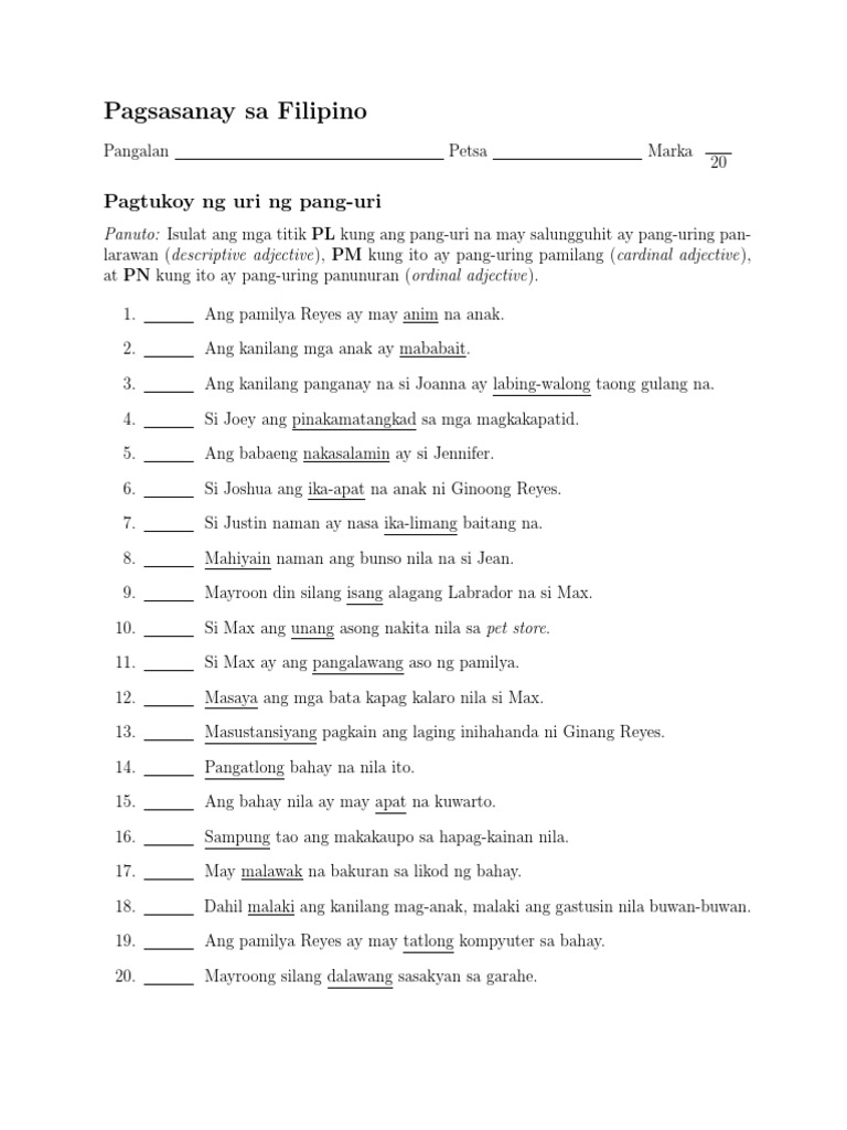 Anyway i was trying to print the Filipino Worksheet regarding Pang-uring Pamilang and Panlarawanbut after clicking download nothing happensi usually get worksheet from your site this is the first time i have encounter this. Displaying top 8 worksheets found for - Pang Uri Panlarawan At Pamilang. This 20-item worksheet asks the student to classify the underlined adjective in the sentence as a descriptive adjective pang-uring panlarawan a cardinal adjective pang-uring pamilang or as an ordinal adjective pang-uring panunuran.