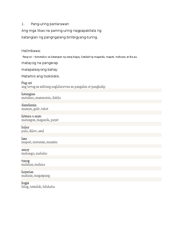 This 20-item worksheet asks the student to classify the underlined adjective in the sentence as a descriptive adjective pang-uring panlarawan a cardinal adjective pang-uring pamilang or as an ordinal adjective pang-uring panunuran. Some of the worksheets for this concept are Kaantasan ng pang uri 6 work Banghay aralin sa pagtuturo ng panimulang pagbasa para sa Gabay ng guro draft april 1 2014 Uri ng mga salita ayon sa kayarian Pang uri na panlarawan Pangalan Grade 7 filipino ikatlong markahan linggo 19 Pangalan. Pang-uri This is an 8-item worksheet on providing an appropriate adjective pang-uri based on the given picture.